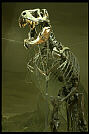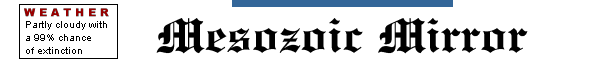 In addition to escaping from the hall, the new T. rex has broken away from tradition. This replica, one of the most complete skeletons ever found, has shattered scientific convention by assuming a revolutionary pose. Unlike the Museum's other rex specimen, which looms upright over Dinosaur Hall, this one is structured in a more life-like position, as if confronting prey or another marauding Tyrannosaur. Long a favorite of museum visitors, the Dinosaur Hall rex is depicted at rest in a vertical position rather than in action. Tempers are sure to flare as the rexes vie for dinophiles' attention on their opposing turfs. The Tyrant Kings of the Lizards last toured the Earth 65 to 67 million years ago during the late Cretaceous period. Their absence from the public eye has been attributed to everything from asteroids to poisonous gas. Like most legends of rock, rumors of a reunion dog the terrible twosome. The most likely forum will be the forthcoming renovated Dinosaur Hall at Carnegie Museum of Natural History. The Tyrannosauri were unavailable for comment. |